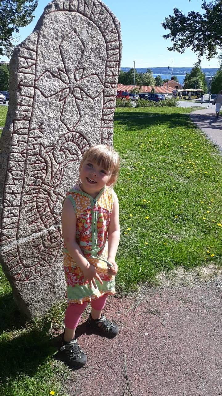 Dagny framför den 1000 år gamla runsten på Frösön med texten: