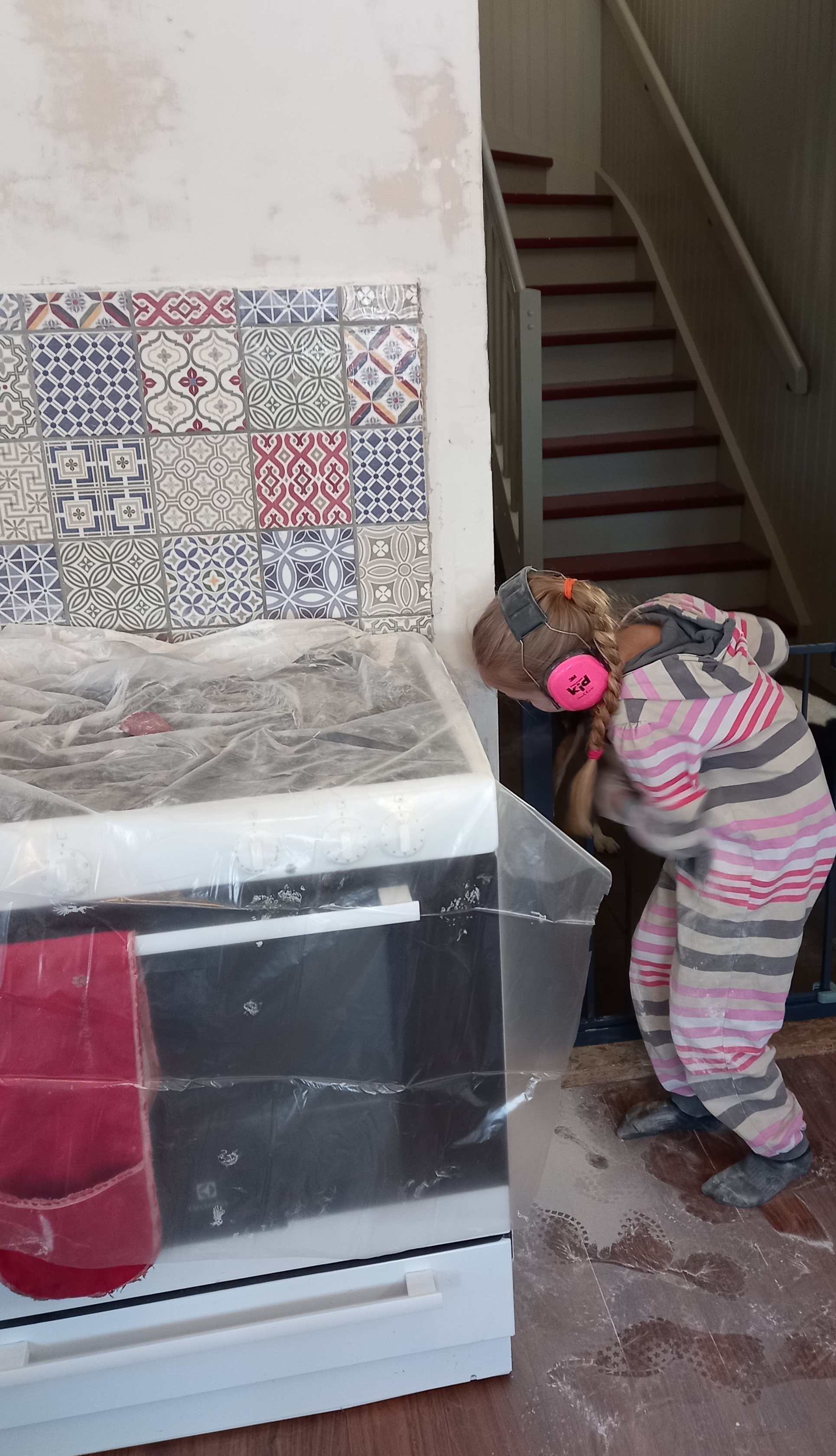 Barnen var dock pigga och Dagny var hjälpsam. Vi slipade spackel och sen städade vi slipdamm. Det la sig liksom precis överallt... 😑