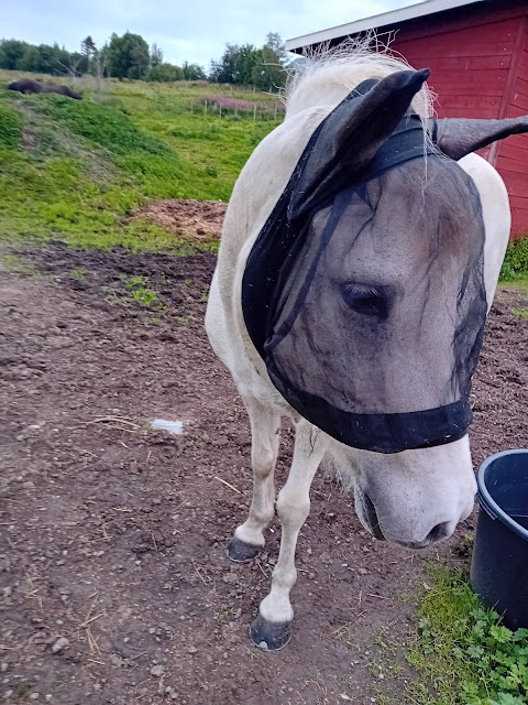 Därefter sprayade vi hästarna med flugspray och satte på dem en varsin ren flughuva. De verkade njuta av behandlingen.